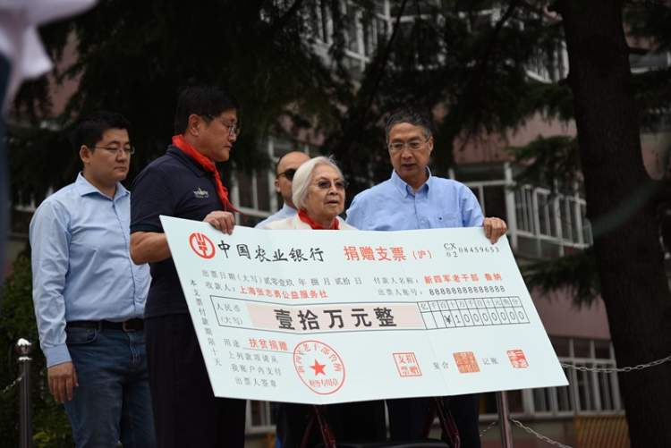 94岁的新四军老战士鲁纳老妈妈专程赶到发车仪式现场,捐出十万元积蓄,希望用于云南地区贫困孩子的学业奖励和资助。