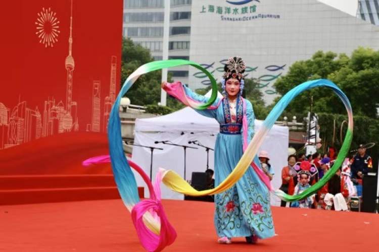 在东方明珠广播电视塔下的城市广场上,上海老年大学教育联盟与上海小荧星艺术团联合演出了21个文艺节目。白发老者、快乐孩童,大手携小手,欢度国庆,喜迎重阳。他们表达着同一个主题——庆祝新中国成立70周年!
