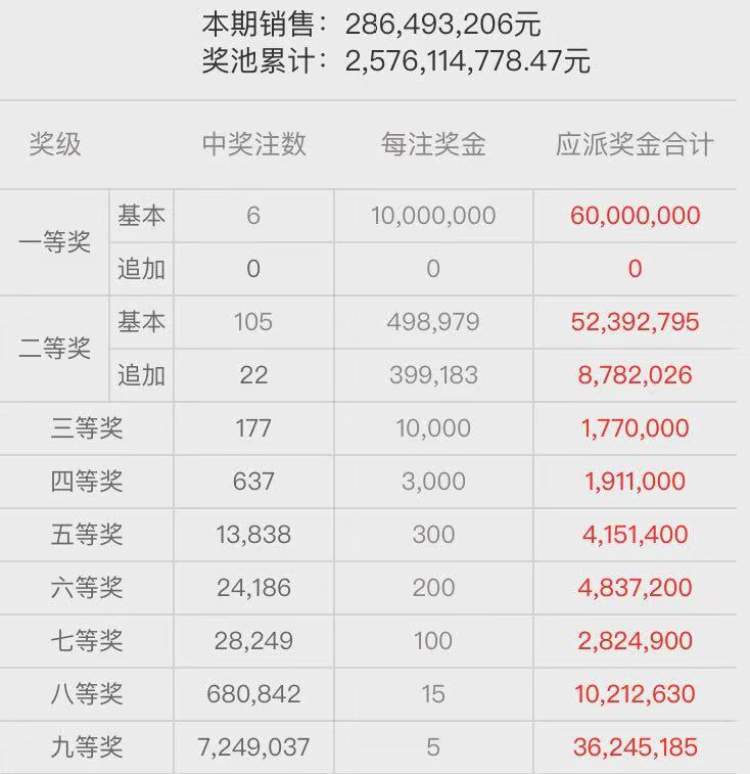 本期二等奖开出105注,每注奖金为49.89万元;其中22注采用追加投注,每注多得奖金39.91万元。追加后,二等奖单注总奖金为89.81万元。三等奖中出177注,单注奖金为10000元。四等奖中出637注,单注奖金为3000元。五等奖中出13838注,单注奖金为300元。六等奖中出24186注,单注奖金为200元。七等奖中出28249注,单注奖金为100元。八等奖中出680842注,单注奖金为15元。九等奖开出7249037注,单注奖金为5元。