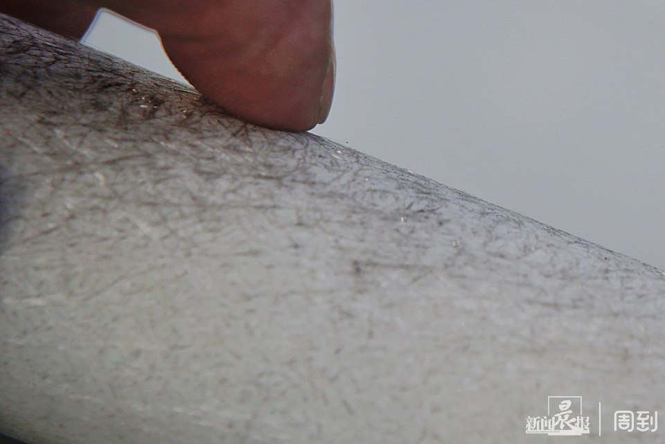 经女儿提示,李女士弯下腰,仔细检查孩子扶过的栏杆,发现皲裂的表面上,的确有一根根玻璃纤维丝一样的东西,在阳光下闪闪发光:“我顿时明白,孩子的手就是被这种疑似玻璃纤维丝的东西扎了。”