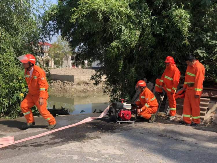 在高压水泵使用项目的比赛中,随着裁判员的红旗一挥,选手们立刻抬起高压水泵奔赴取水口,接好水管,发动水泵,同步接通消防水管,然后出水,向“着火”的树木喷水,最快的队伍仅用了33.25秒。