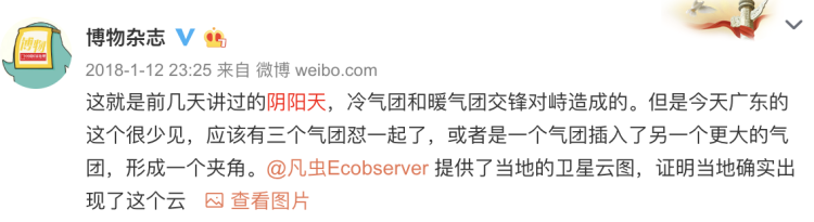 “博物杂志”官方微博也曾多次回答网友提问,称“阴阳天”是冷空气和暖空气正在天上对峙交锋造成的。