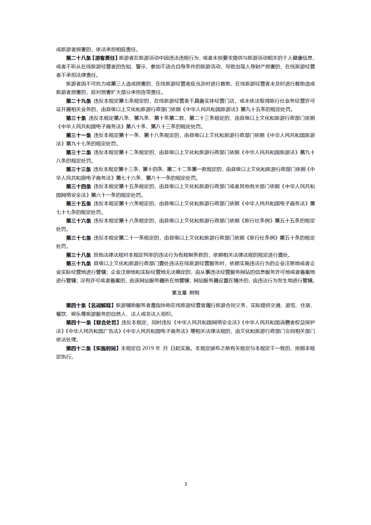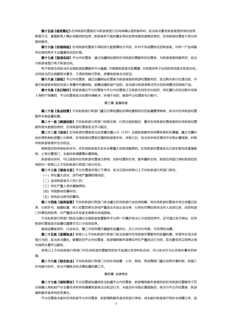 文化和旅游部表示,《暂行规定》共五章四十二条,分为总则、运营、监督检查、法律责任、附则等部分,主要内容明确了适用范围和相关主体,明确了平台相关责任,回应了社会热点问题,增加了旅游者自损规定。该征求意见稿遵循四大基本原则,即坚持促进与规范相结合、坚持问题导向、坚持互联网行业同向发展、坚持夯实平台主体责任。
