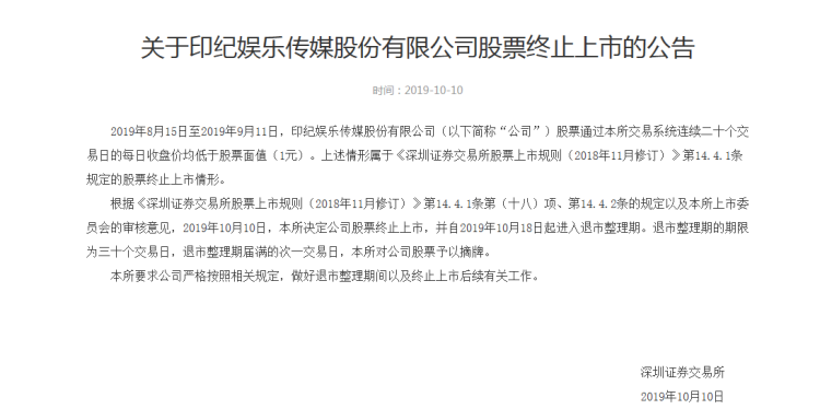 10月10日盘后,深交所公告,2019年8月15日至9月11日,印纪娱乐传媒股份有限公司股票连续二十个交易日的每日收盘价均低于股票面值(1元)。根据规定以及深交所上市委员会的审核意见,2019年10月10日决定公司股票终止上市,并自2019年10月18日起进入退市整理期。退市整理期为三十个交易日,退市整理期届满的次一交易日对公司股票摘牌。