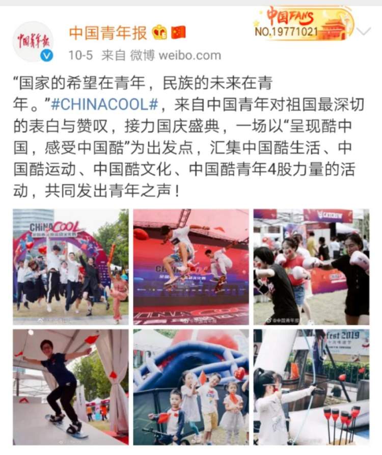 #CHINACOOL#线上相关话题短短几天内阅读数突破2000万次,讨论互动量超2万人次。由中国青年报等主流媒体官博支持发声;五星体育、央视体育等媒体现场采访;新华报业、人民网、凤凰通讯社、澎湃新闻等百余家媒体报道,单日活动直播观看人数超过百万,CHINACOOL线上超强热度,汇集青年先锋力量发出青年之声。