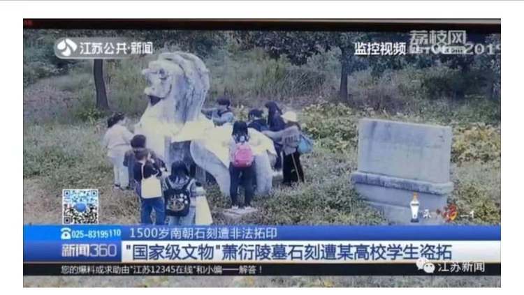 近日,位于江苏丹阳南朝陵墓的三只石兽被上海大学上海美术学院的一群学生私自拓印,此事经游客举报后,文物管理部门到现场制止,相关带队老师被处罚。