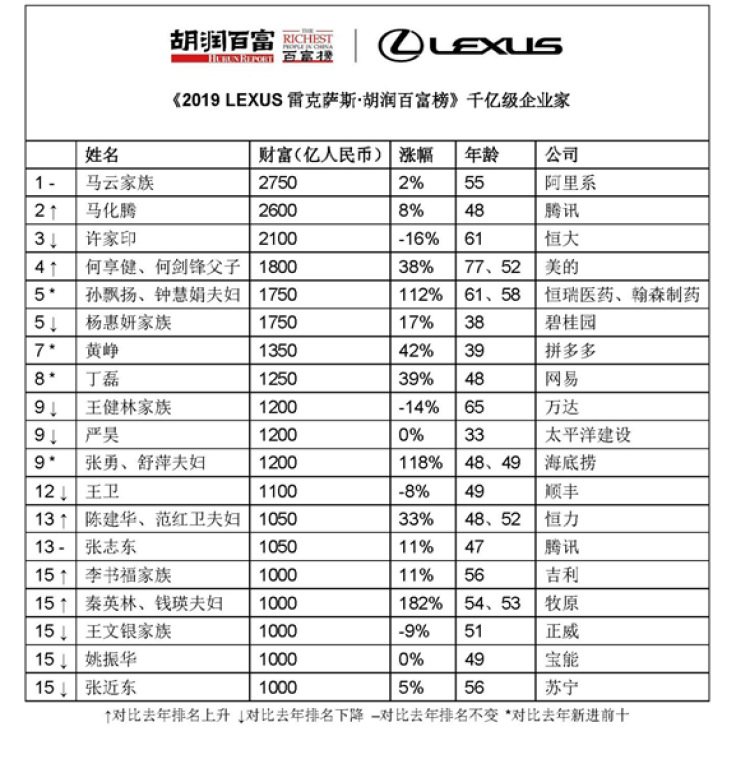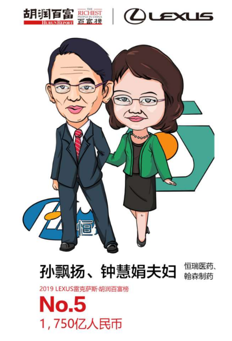前十名中4位新人,包括财富涨幅最大的恒瑞医药和翰森制药的孙飘扬、钟慧娟夫妇和海底捞的张勇、舒萍夫妇,以及拼多多的黄峥和网易的丁磊。同时,今年首次有医药行业的企业家进入榜单前十位。伴随着翰森制药今年6月在港交所上市,孙飘扬、钟慧娟夫妇以1750亿元的财富排名榜单第5位,比去年上升15位。