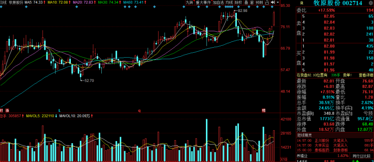 10月10日,在良好三季报业绩预期下,牧原股份(002714)股价大涨7.91%连收5阳。作为河南首富,执掌牧原股份的秦英林、钱瑛夫妇以1000亿财富排名今年胡润百富榜第15位,比去年上升55位。