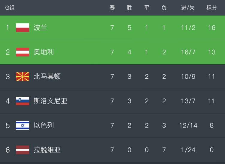 在主场全取三分之后,之前排名小组第三的奥地利队以4胜1平2负积13分的成绩,已经升到了第二名,领先同积11分的斯洛文尼亚对和北马其顿队2分。