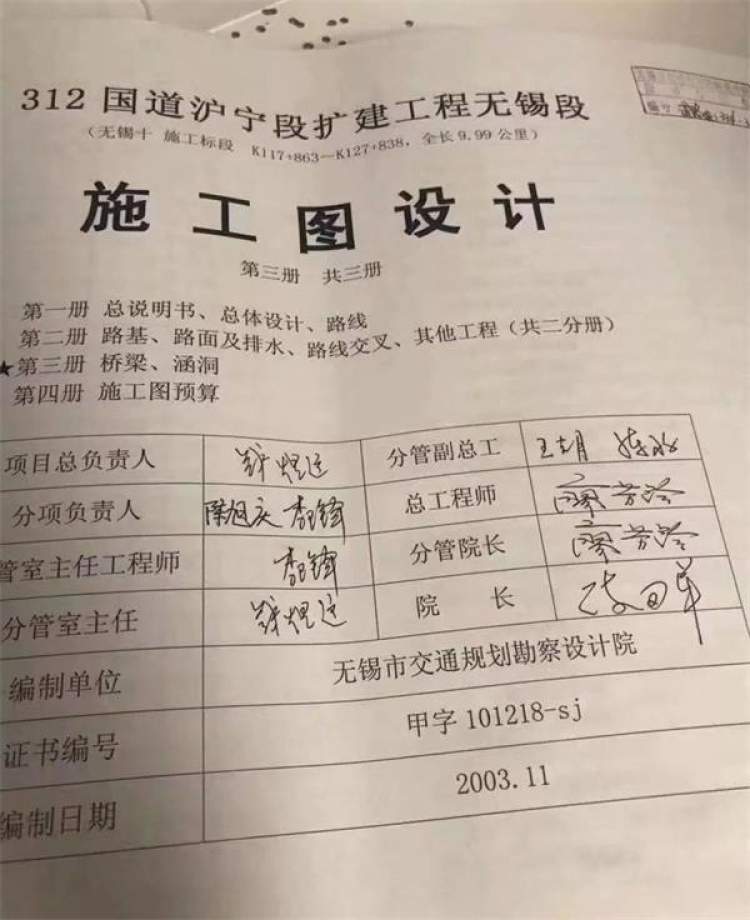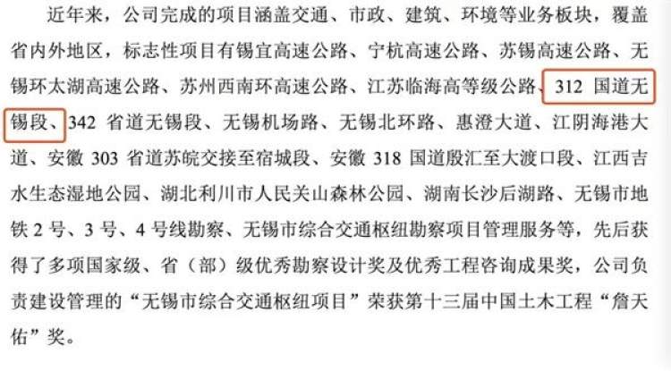 一份《312国道沪宁段扩建工程无锡段施工图设计》文件封面显示,该路段的编制单位为无锡市交通规划勘察设计院。天眼查显示,该公司2015年3月更名为江苏中设集团股份有限公司,即上市公司中设股份(002883)。中设股份2015年底发布的招股书申报稿和2107年的招股书中,312国道无锡段出现。目前中设股份未发布相关公告。