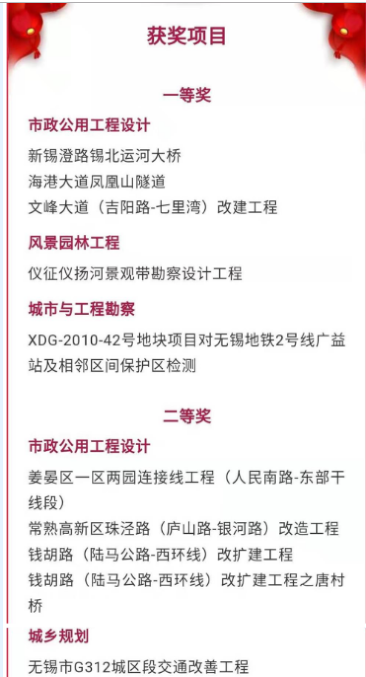 据公司官网发布, 8月28日,2019年无锡市城乡建设系统优秀勘察设计评选结果最新出炉,公司在建筑工程设计(含地下建筑)、市政公用工程设计、风景园林工程、城乡规划、城市与工程勘察六大类中共计获奖24项。其中无锡市G312城区段出现。
