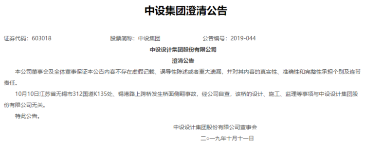 11日早间,中设集团(603018)发布澄清公告称,10月10日江苏省无锡市312国道K135处、锡港路上跨桥发生桥面侧翻事故,经公司自查,该桥的设计、施工、监理等事项与中设设计集团股份有限公司无关。