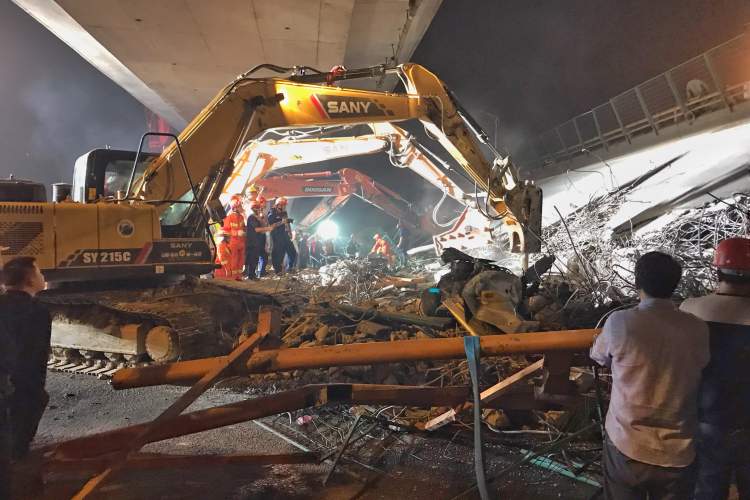 此时,被压的三辆车辆中,停放的车辆已证实为空车。其余两辆车都有人员被困,白色轿车车身直接被桥面砸中,黄色轿车则是车头先被桥面砸中。