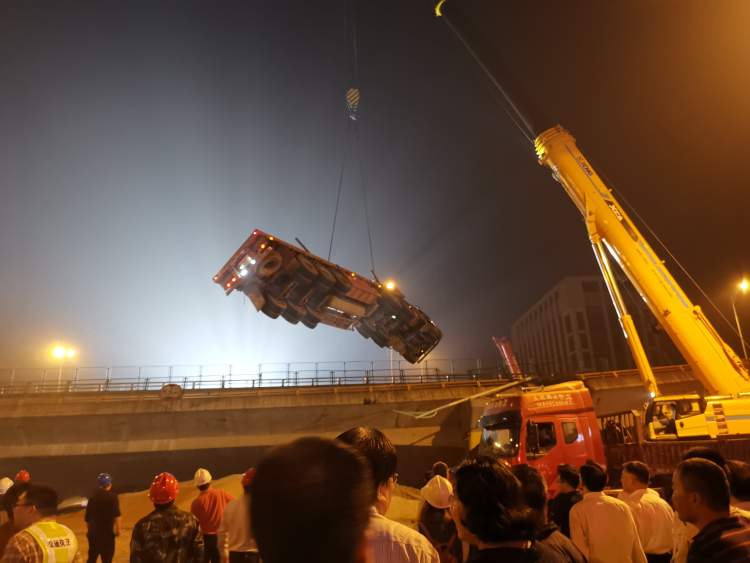 要对被压车辆进行救援,先需要抬起侧翻的桥面,在抬起桥面之前,先要把侧翻在桥面上的那辆大卡车吊起来。