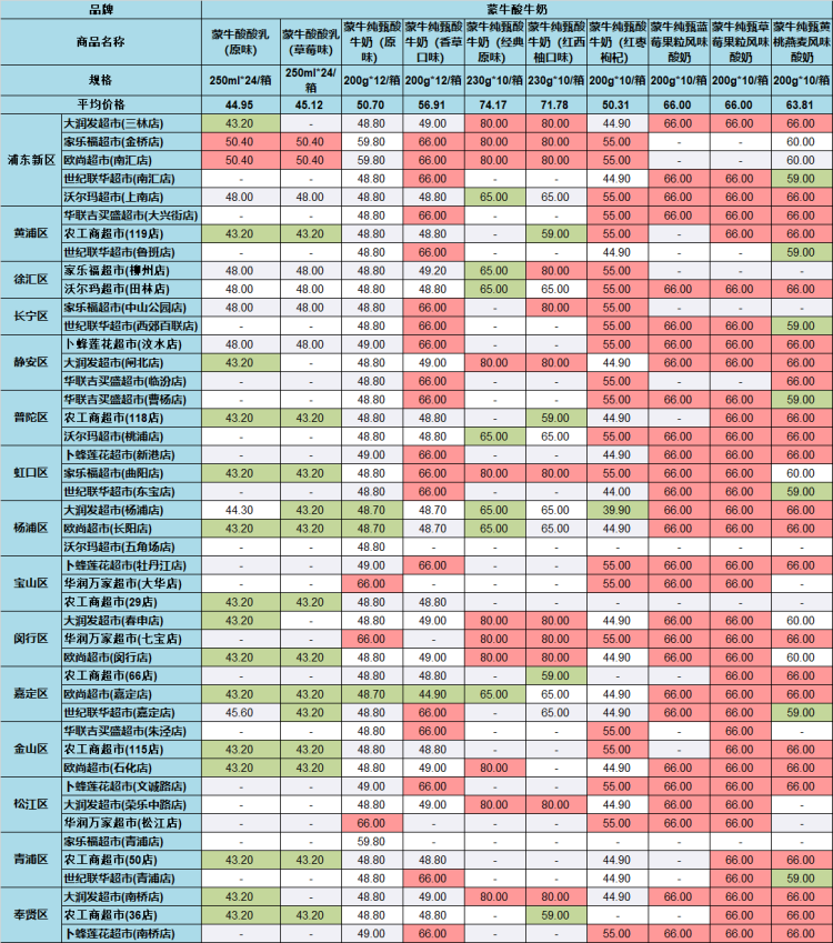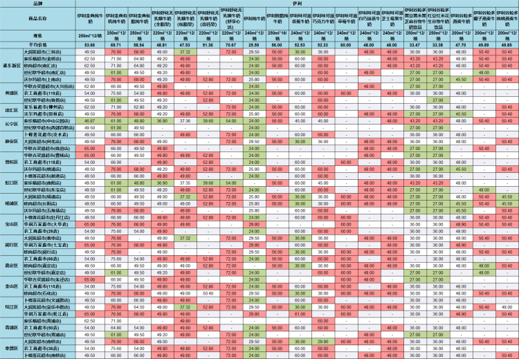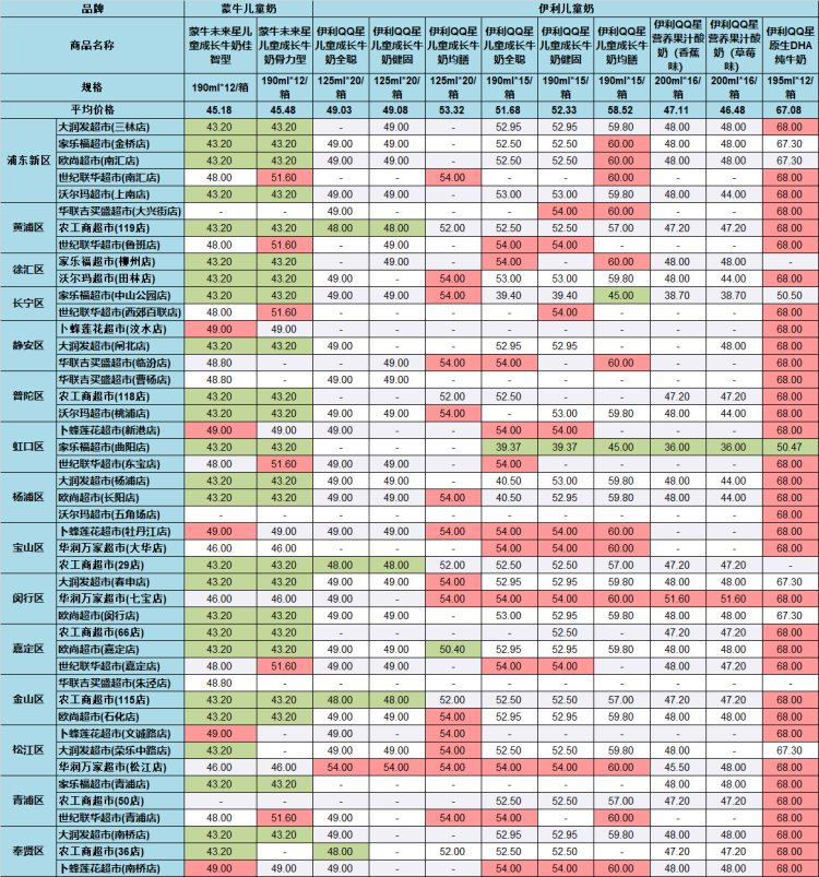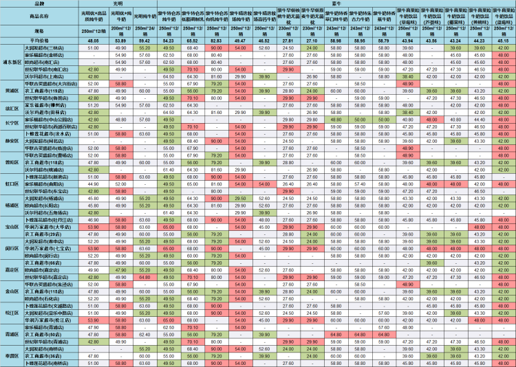 市价监成调队今日公布了沪上45家超市部分常温乳制品的价格,品牌包括光明、蒙牛和伊利。
