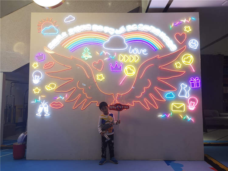 将社会主义核心价值观通过彩色霓虹灯设计的方式呈现在砖墙上,中央还有一对粉色的翅膀,是一面网红拍照墙。