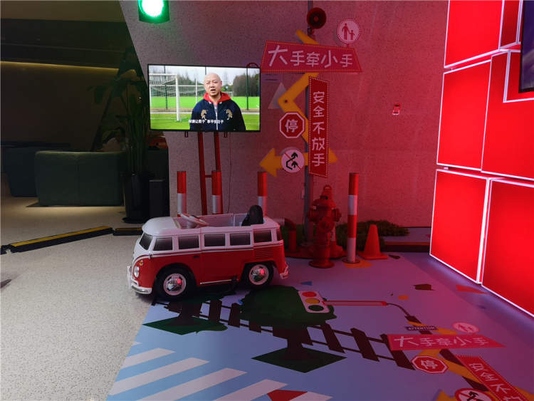 这一块区域设置了创意互动装置和文明出行标语,配合行人、机动车、非机动车的交通法规推广,倡导市民文明出行。
