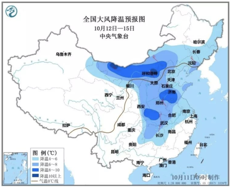 而中央气象台预计,这股冷空气将从明天起至15日,自北向南影响我国,中东部地区将出现大风降温和大范围降水天气。