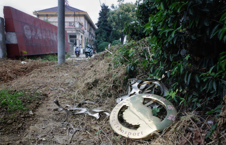 公司铜质铭牌的一部分散落在门外野地里