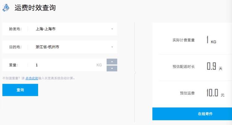 记者在中通官网“运费时效查询”系统中查询时看到,上海发往杭州的预估费用显示为10元。