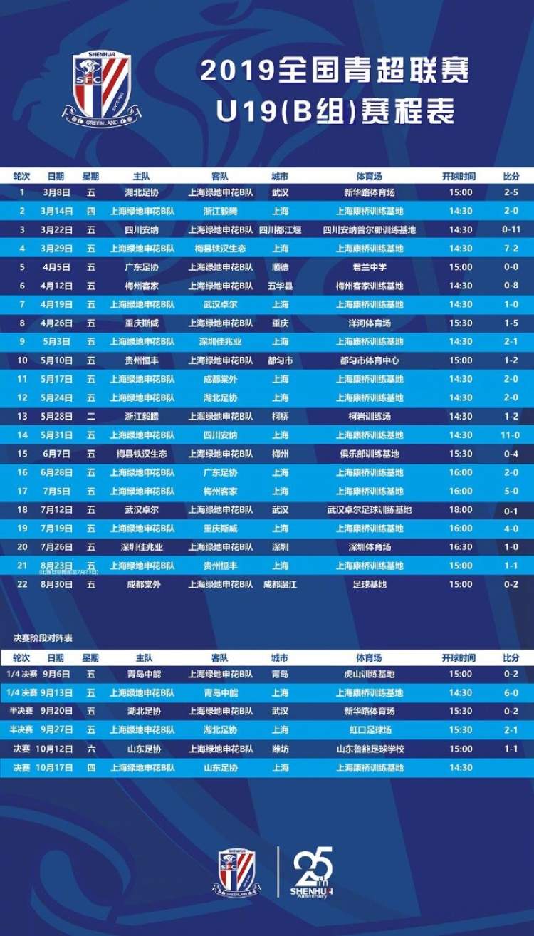 申花是在淘汰了湖北足协后进入到决赛的。上个赛季,这支队伍获得了2018青超联赛U17组冠军。本赛季,申花的这支梯队延续的不俗的表现,在已经进行的26场比赛中取得了23胜2平1负的战绩。申花的对手鲁能本赛季的表现也很出色,他们至今没有输过比赛,战绩为23胜3平。