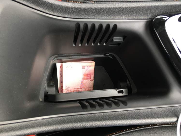 车尚君还在车里发现了一个有趣的设计细节——前排杯架的双插片及多插槽设计,让你可以自定义空间的大小,而且在下方还设有一个暗层,同车的伙伴开玩笑说这是专为藏私房钱而设计。