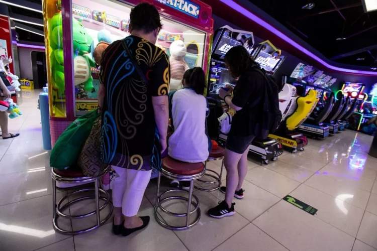 这家游艺厅并非只是年轻人的天下:中年宅男们在“拳皇97”和“拳皇98”上重温青春、阿姨抱着一桶“金币”屏住呼吸抓娃娃……