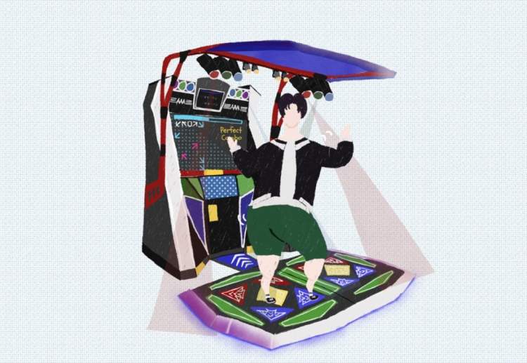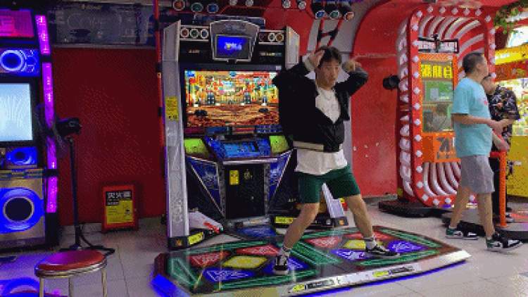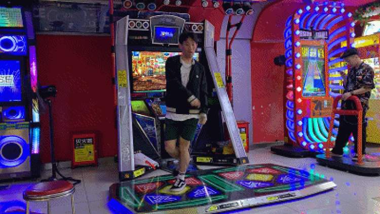 这位“大叔”却完全不care(在意)得分,他面朝着游艺厅里来来往往的人流,脚下的跳舞板对他来说,更像是一方小小的舞台。