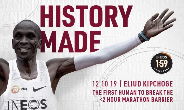 承载人类破2希望的吉普乔格这回没有错过机会,在两万名观众山呼海啸的助威声中,他以1小时59分40秒冲过终点,成为人类历史上首位跑进2小时的马拉松运动员。
