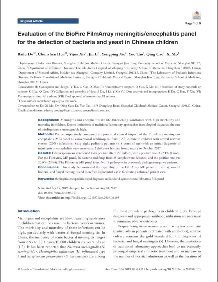 国家儿童医学中心(上海)、上海交通大学医学院附属上海儿童医学中心儿科转化医学研究所感染研究室莫茜教授、曹清教授领衔的感染研究团队近日在国际杂志《Annals of Translation Medicine》上发表了最新研究成果,在国内首度研究证明这种分子检测手段-FilmArray ME Panel可以显著提高细菌、病毒和真菌性脑膜炎的检出效率,对临床作出正确的诊断决策并快速开展精准抗感染治疗具有重大意义。