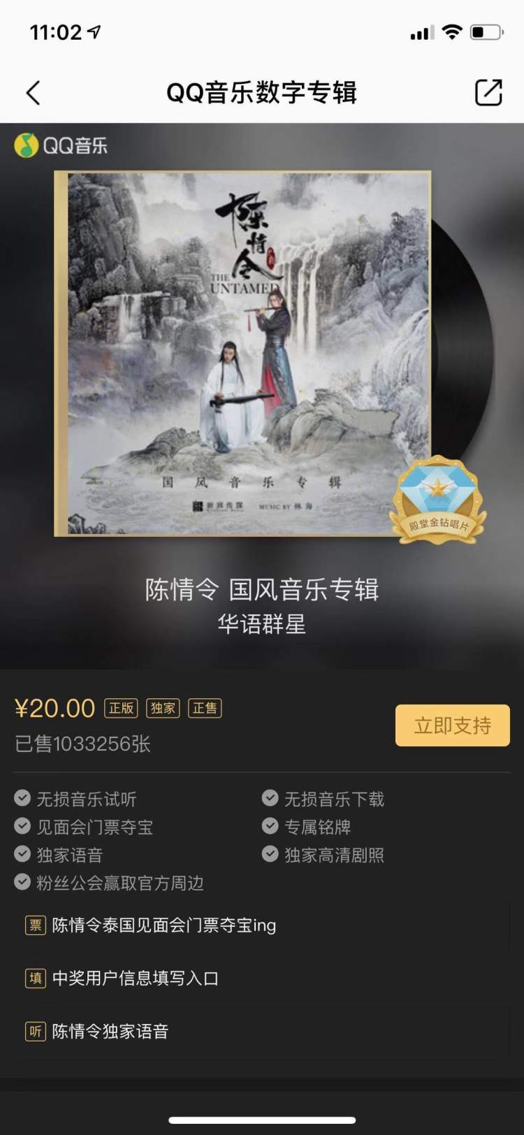 播出期间,QQ音乐推出了“陈情令国风音乐专辑”,单张定价20元,目前销售量已超一百万,预计收入2000多万元。