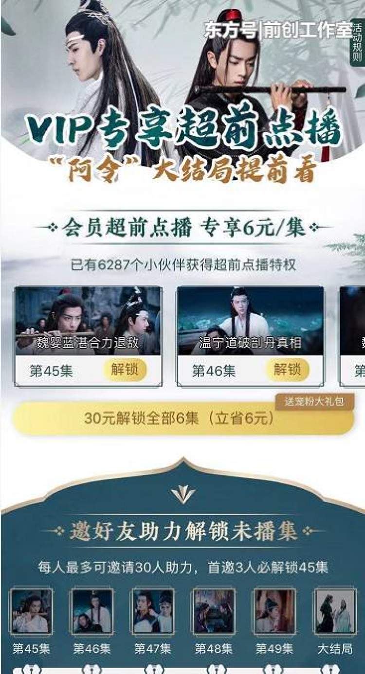 同时,《陈情令》主题曲《无羁》官方MV以会员3元、非会员12元进行销售——注意,购买后只有3天有效期,过期不管是否缓存都必须重新买才可以看。临近收官时,该剧开启了“30元提前解锁大结局”的安排——已经购买了VIP的会员依然需要充值付费才能提前解锁大结局,外界预估该剧由此又有了过亿的收入。