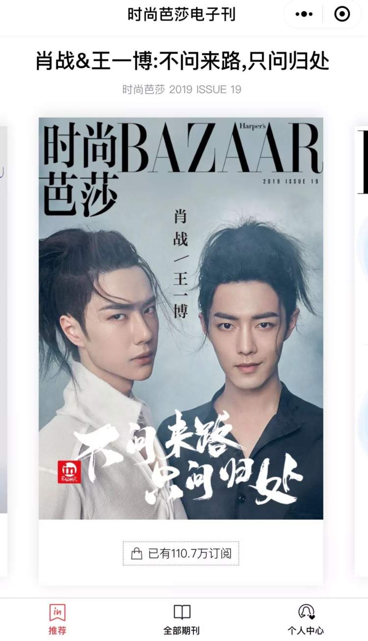此外,主演王一博与肖战合体登上《时尚芭莎》杂志的《陈情令》专刊,销量突破100万,打破了白宇朱一龙双人刊的销量记录。