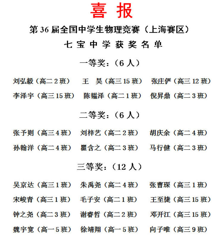 本次竞赛中,七宝中学另有6个二等奖和12个三等奖入账。其中,刘弘毅同学进入上海市队,将和来自其他高中的市队队员一起,代表上海参加于10月24日-31日在杭州举行的第36届全国中学生物理竞赛决赛。