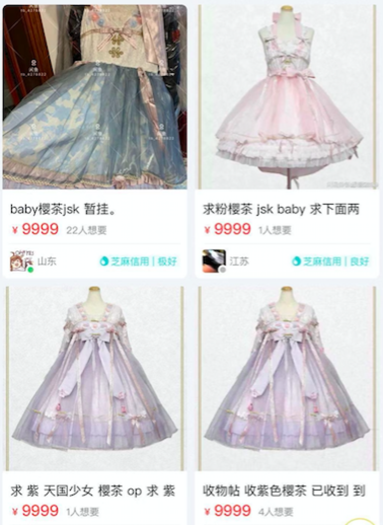 考虑到lo裙的的特殊性,日版许多裙子都是限时或者限量购买,“很可能过了那个时间点,就很难再买到这种裙子了。”因此,不少lo娘都只能通过二手平台入高价收购心仪的lo裙,这也就是为什么很多lo裙会在之后价格翻倍的其中一个原因。