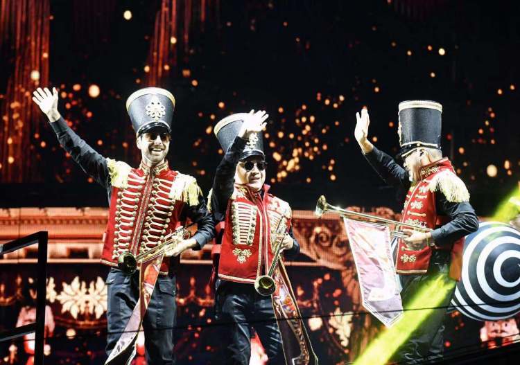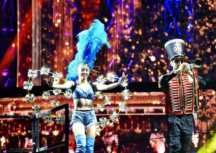 紧接着,在一阵鼓乐声中,小丑、舞者、杂耍演员一一登场与观众打招呼。