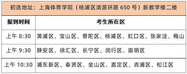 初选原本安排在上海市教育考试院进行,现改在上海体育学院(杨浦区清源环路650号)新教学楼二楼进行。