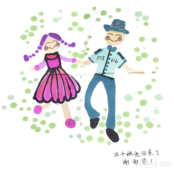 “信里有一幅孩子画的画,画里的小女孩扎着两个长辫子,牵着一位戴警帽的叔叔的手。画的右下角写着一句话:‘孩子她爸回来了,谢谢您’。”