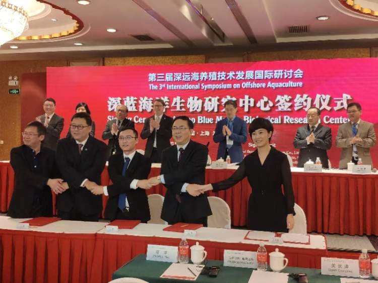 会上,上海耕海渔业有限公司、中国水产科学研究院东海水产研究所、中国水产科学研究院渔业机械仪器研究所、中国船舶及海洋工程设计研究院、上海临港海洋高新技术产业发展有限公司共同签署了五方联合声明,达成合作成立 “深蓝海洋生物研究中心”意向。