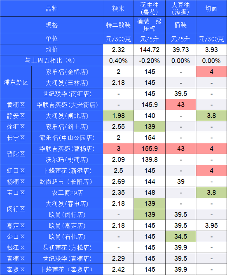 ■粉底标注代表该粮油品种在上述超市的最高价;绿底标注代表该粮油品种在上述超市的最低价
