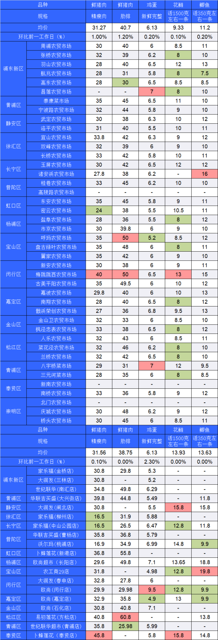 ■粉底标注代表该肉蛋鱼品种在上述农贸市场或超市的最高价;绿底标注代表该肉蛋鱼品种在上述农贸市场或超市的最低价