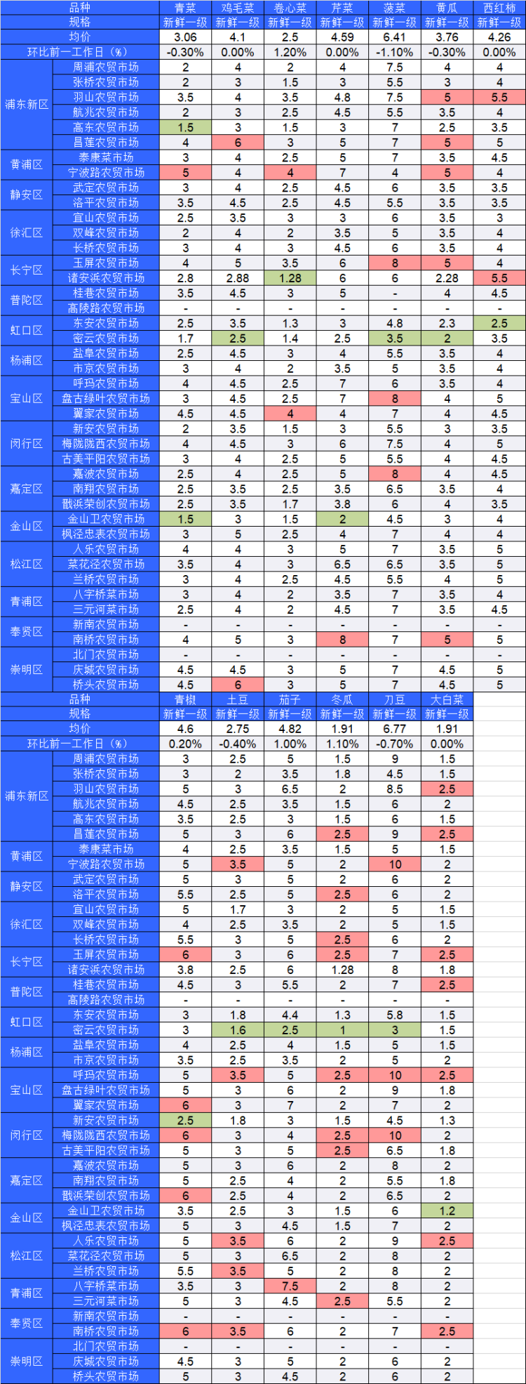■粉底标注代表该蔬菜品种在上述农贸市场或超市的最高价;绿底标注代表该蔬菜品种在上述农贸市场或超市的最低价