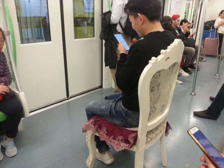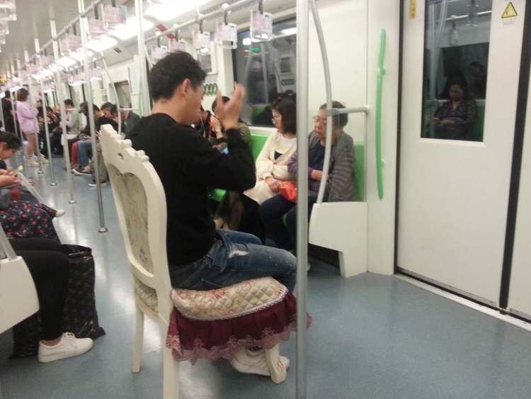 记者将所拍摄的“椅子男”的照片出示给一位站务员。他判断说,这把椅子目测是可以允许带进车站,但不能坐于其上而影响车厢乘客的通行。