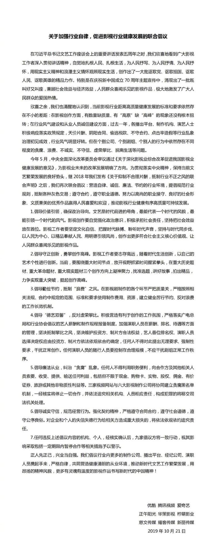 继去年联合发布声明抵制明星不合理片酬和行业不正之风以来,今天上午,优酷、腾讯视频、爱奇艺三大视频网站联合正午阳光、华策影视、柠萌影业、慈文传媒、耀客传媒、新丽传媒六家影视制作公司,共同发布了《关于加强行业自律,促进影视行业健康发展的联合倡议》(以下简称“《倡议》”),对演员“抢番位”“争待遇”的做法说“不”,并宣布将协同建立行业贪腐黑名单机制,一经核实将停止一切合作。