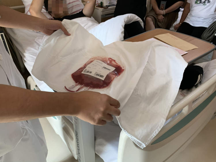 9月25日,上海市第一人民医院特需病房里,在志愿者所有家庭成员和红字会工作人员的注目下,儿科医院血液科医生从上海市第一人民医院血液科医生的手里接过了还带着志愿者体温的造血干细胞。