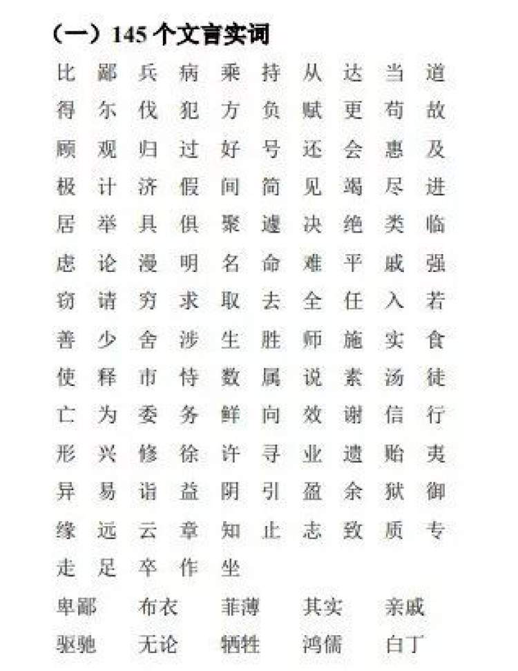 下图为《2020年上海市初中语文课程终结性评价指南》中公布的145个文言实词。
