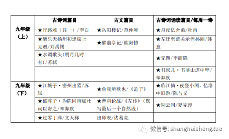 下图为《2020年上海市初中语文课程终结性评价指南》中公布的古诗文课内篇目。