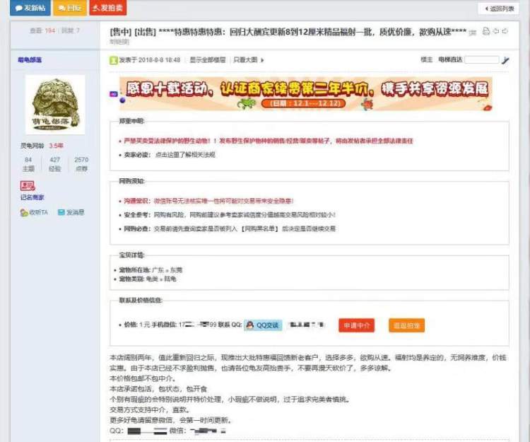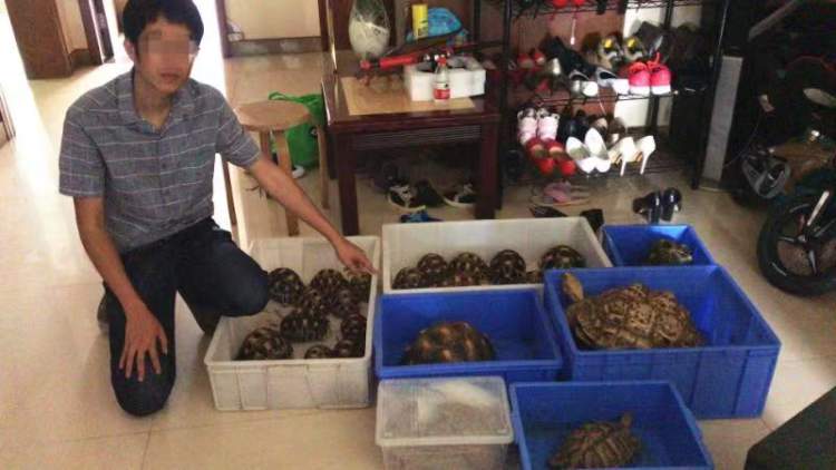 2018年12月,徐汇公安分局接群众举报:有人在互联网上发布出售国家重点保护动物的信息,并通过微信进行售卖。民警随即展开调查,发现有人在网上出售辐射陆龟。