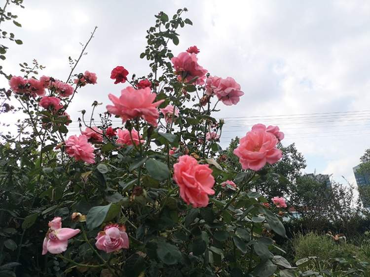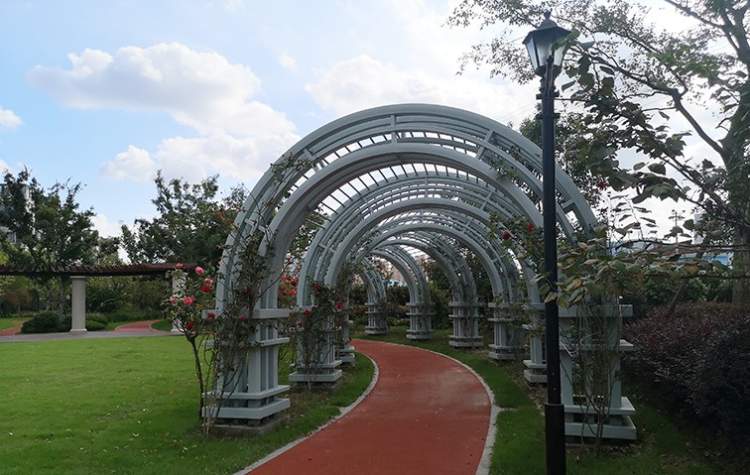 榔架、拱门周围簇拥着娇艳的月季。这里听不到车水马龙的喧嚣,偶尔能听到火车鸣笛。很少听到这种轰鸣了,勾起了不少回忆啊!更难得的是,偌大个花园里只有两三个人在散步。