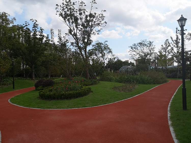 这是一座静美的花园,蓝天白云下,大片绿草地上有一圈红色步道。秋风渐起,桂花香浮动。